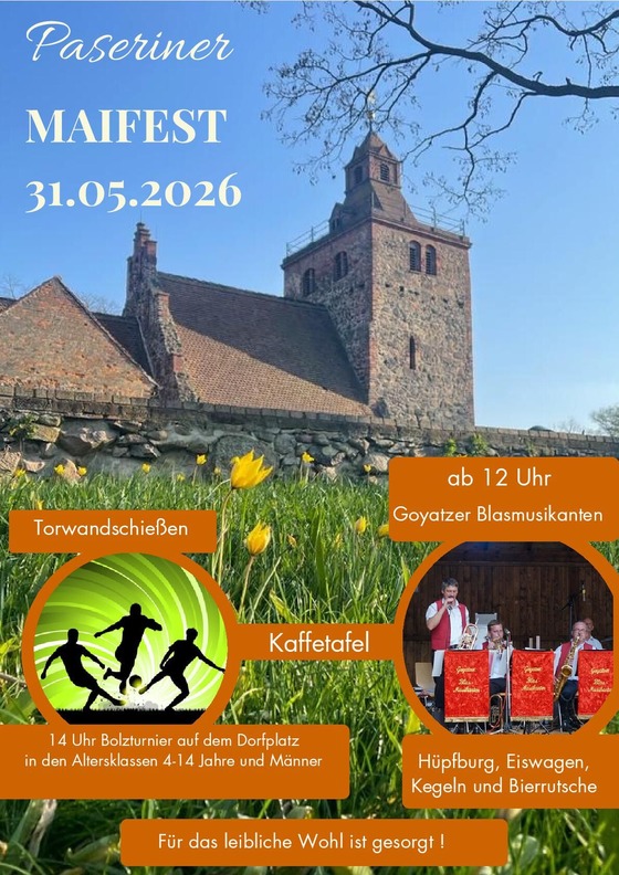 Am 31. Mai 2026 findet das traditionelle Maifest in Paserin statt. Ab 12:00 Uhr spielen die Goyatzer Blasmusikanten und um 14:00 Uhr findet ein Bolztunier auf dem Dorfplatz in den Altersklassen 4-14 Jahre und Männer statt.